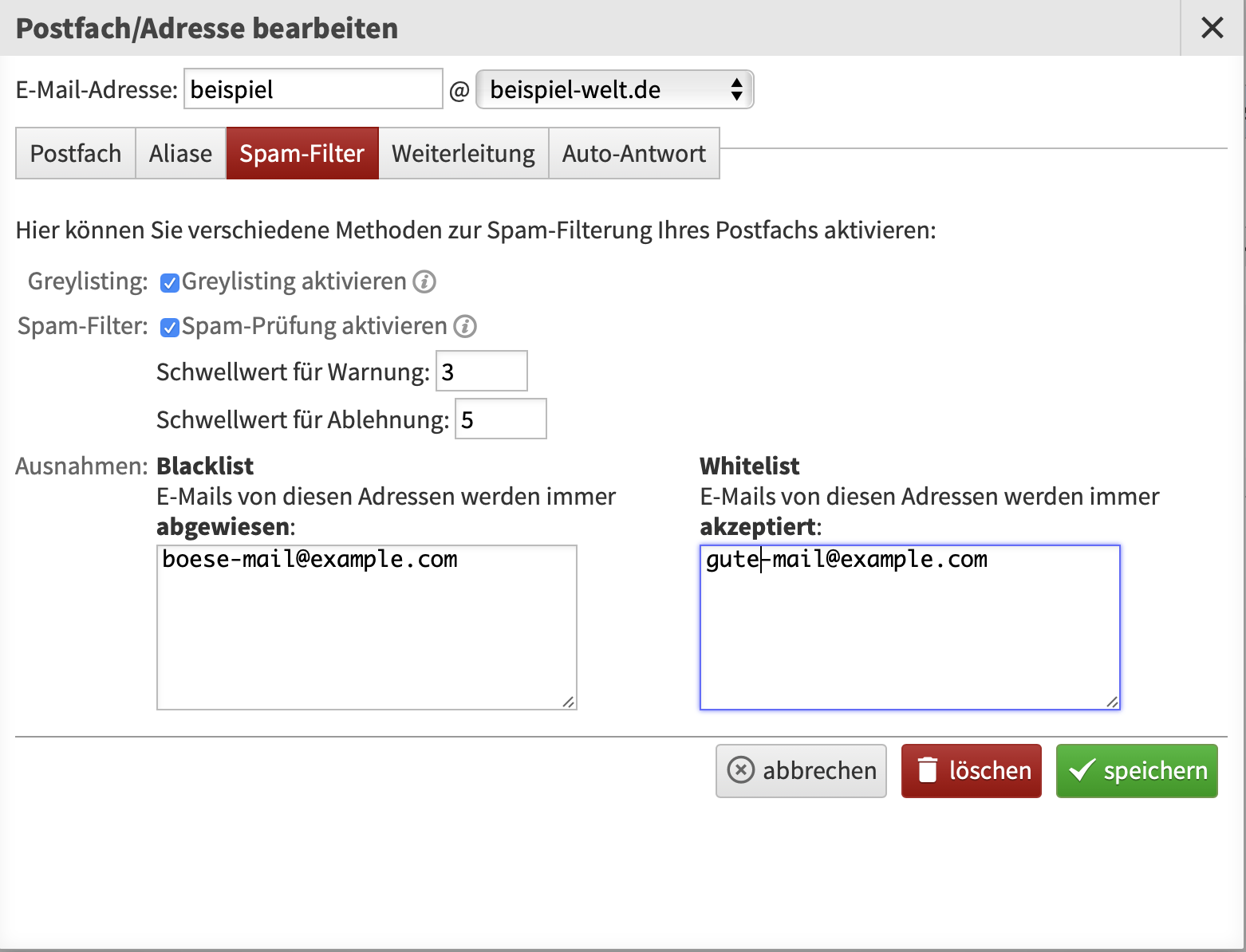 Natürlich ist hier auch der umgekehrte Weg möglich: Durch Eintragen einer Adresse unter Whitelist erfolgt die Zustellung der Mail auch, wenn sie vorher als Spam erkannt wird.