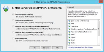 Passen Sie bei Bedarf die Liste der zu archivierenden Ordner (nur bei IMAP möglich), den Filter (nur bei IMAP möglich) und die Löschoptionen an. Standardmäßig werden keine E-Mails aus einem Postfach gelöscht. Der Timeout-Wert muss nur im konkreten Bedarfsfall (z.B. bei sehr langsam reagierenden Servern) angepasst werden.
