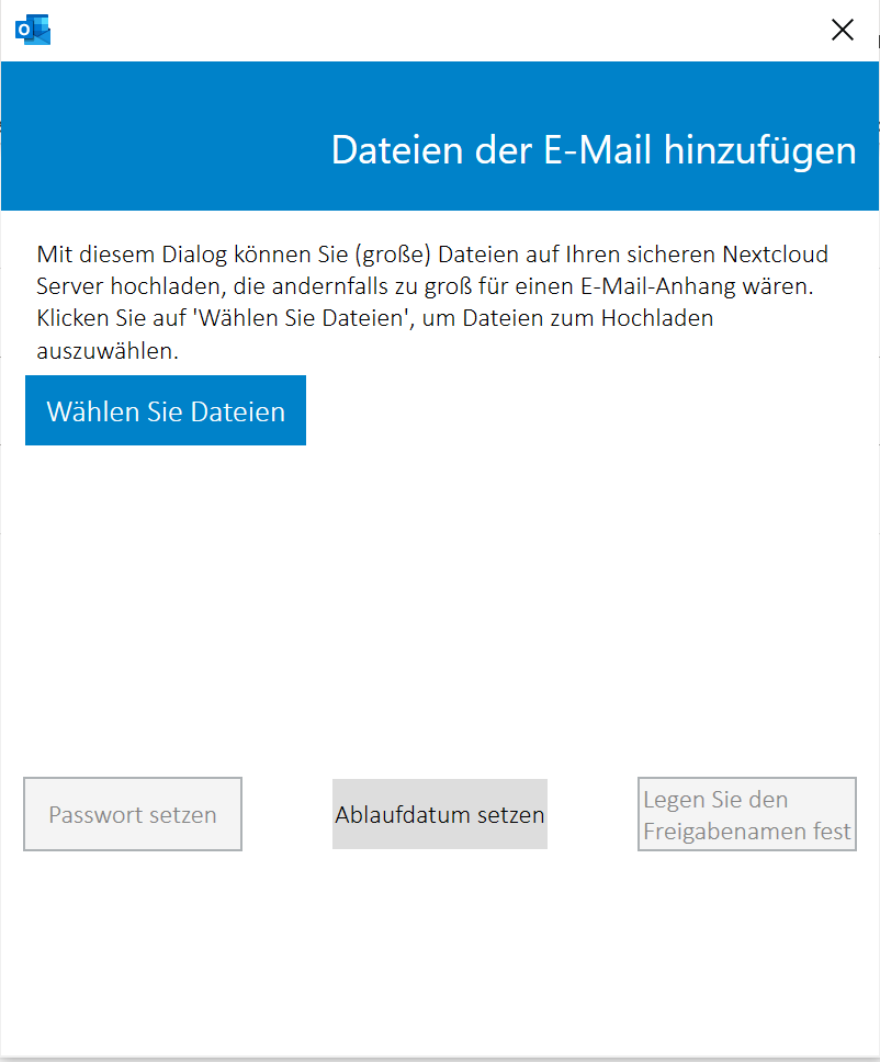 Es erscheint nun eine Box, in der Sie die Dateien auswählen, mit einem Ablaufdatum und mit einem Passwort versehen können.
